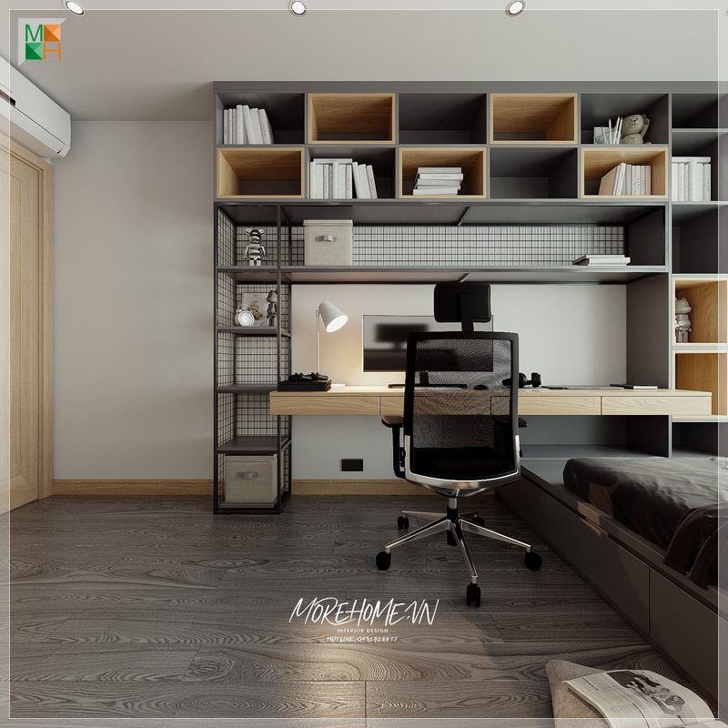 Mẫu tủ hiện đại kết hợp kệ giá sách và bàn làm việc thiết kế âm tường kịch trần rất thông minh và tiện lợi cho phòng ngủ hiện đại.